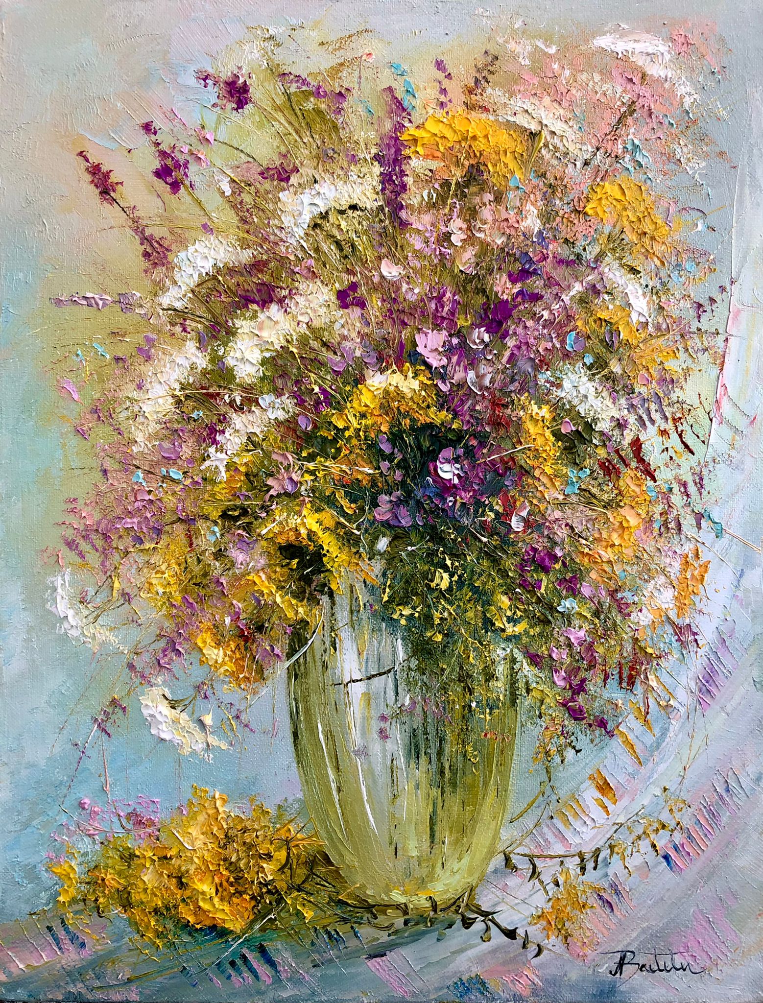 Pictura in ulei pe panza, realizata manual in cutit, dim.45*35 cm, disponibil inramat.