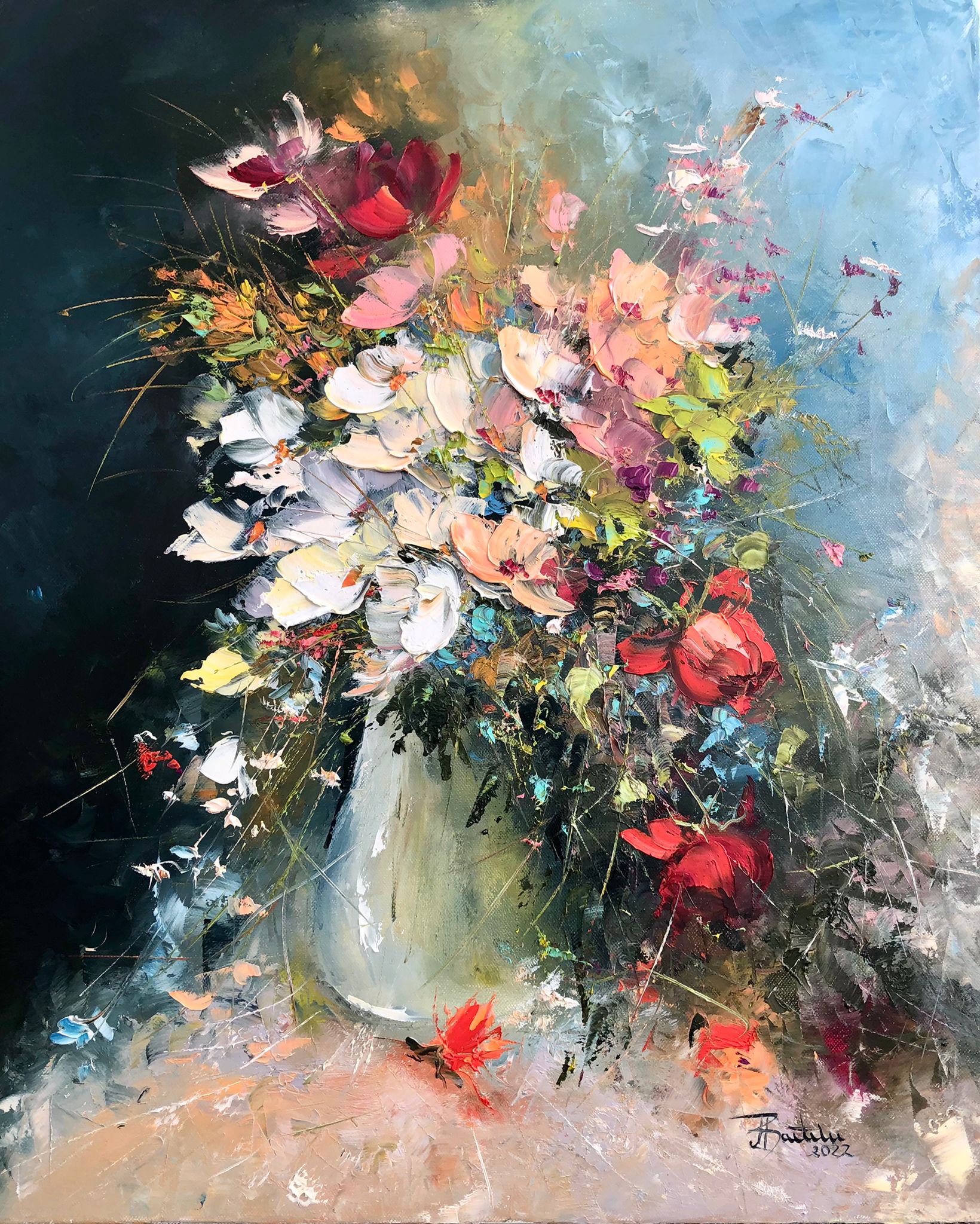 Pictura in ulei pe panza, realizata manual in cutit, dim. 60*50 cm, disponibil neinramat. Se poate inrama la cerere,