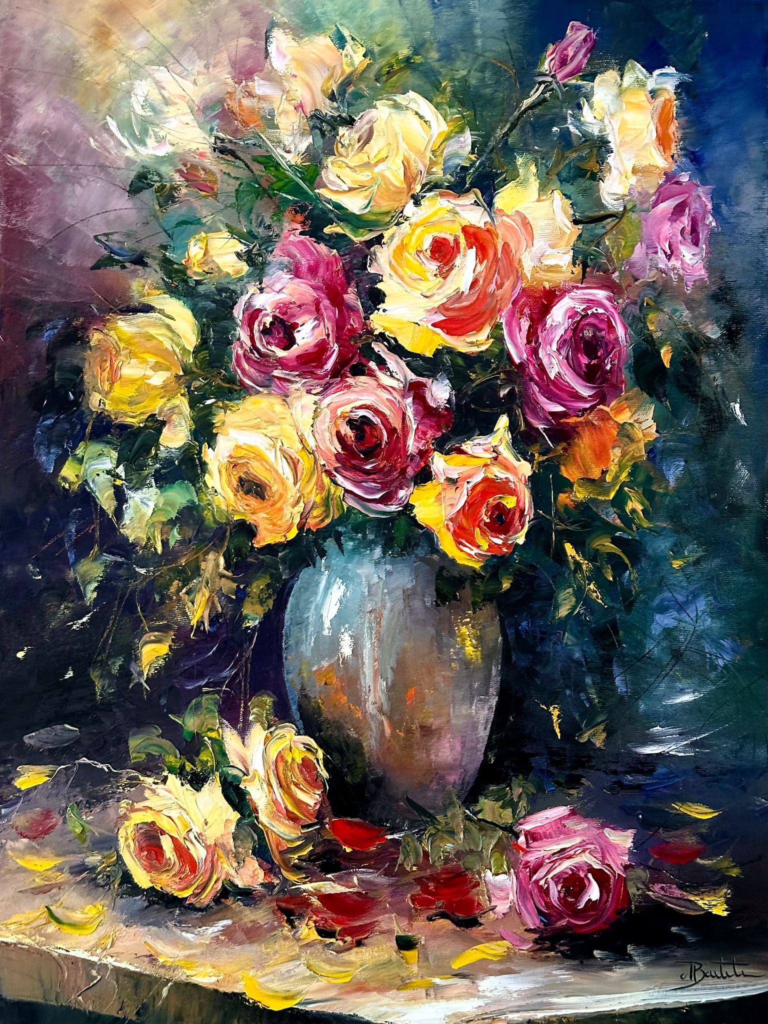 Pictura in ulei pe panza, realizata manual in cutit.Dimensiuni 60*45 cm, neanramata